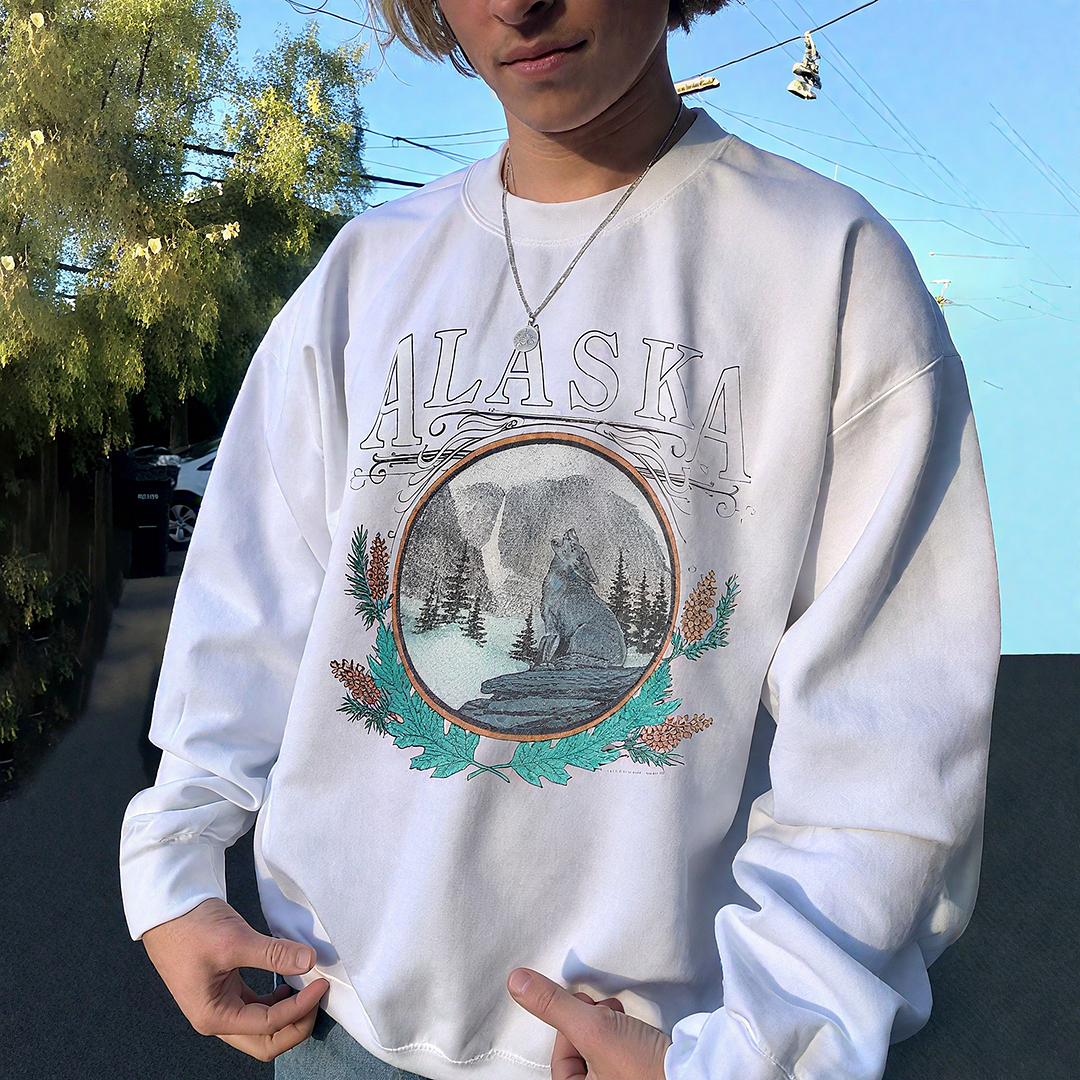 • Design Elements: Detailed graphic print with a wolf and forest scene, "Alaska" text design