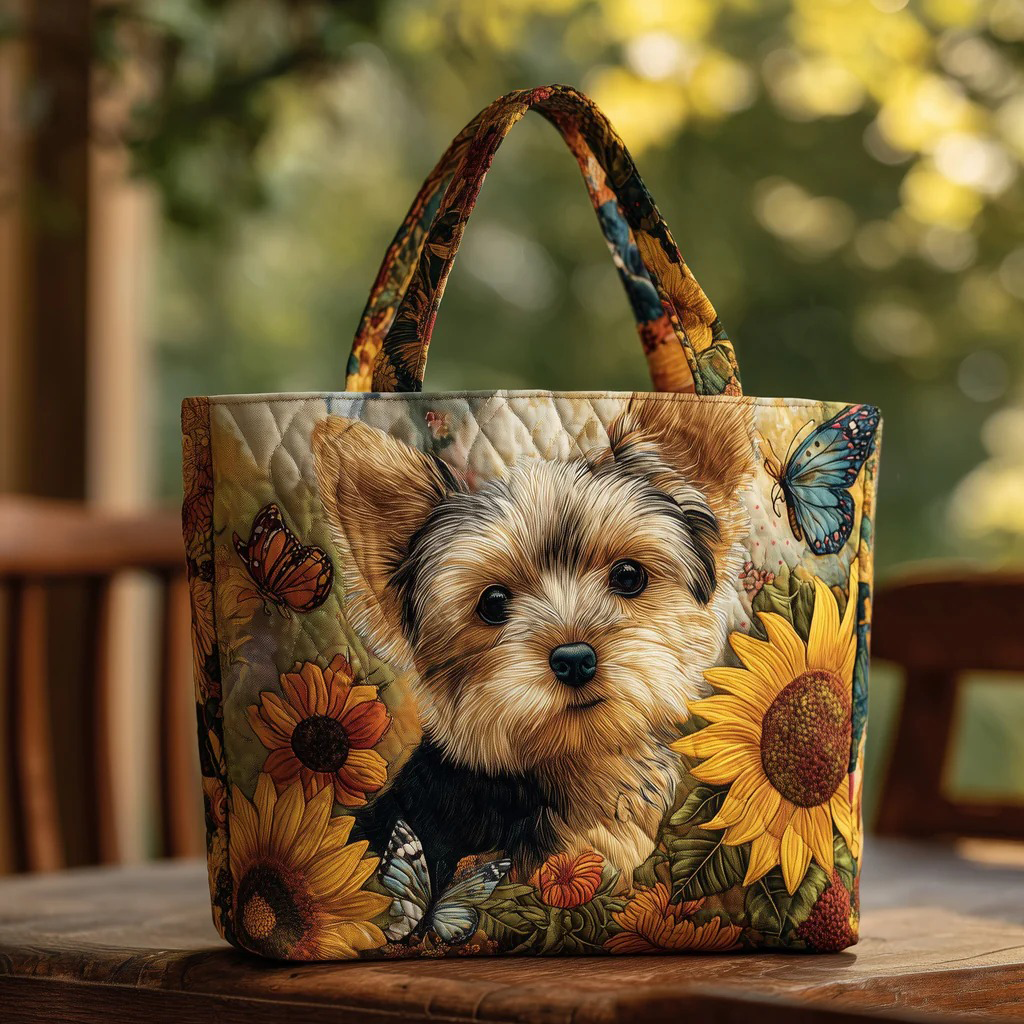 • Design Elements: Yorkshire Terrier portrait, sunflowers, butterflies, floral patterns