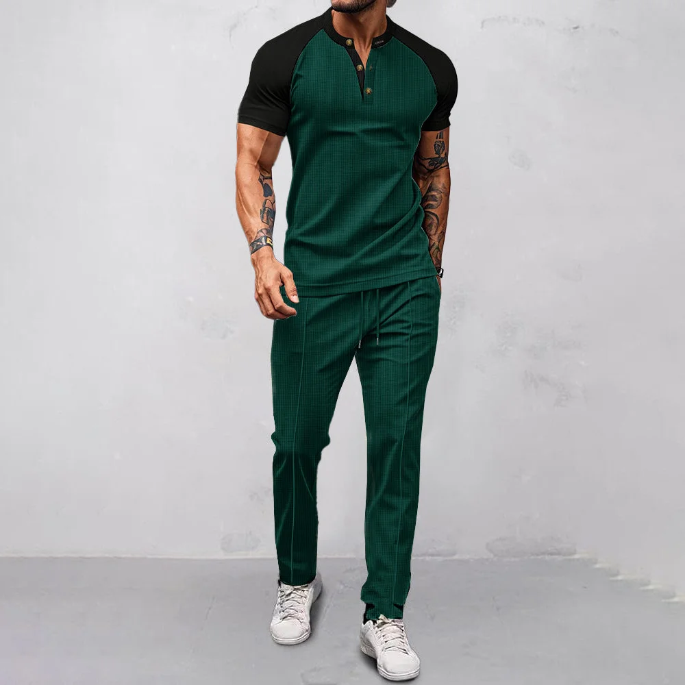 Men's Casual Color-Block Waffle-Knit Short-Sleeve T-Shirt & Long Pants Two-Piece Set