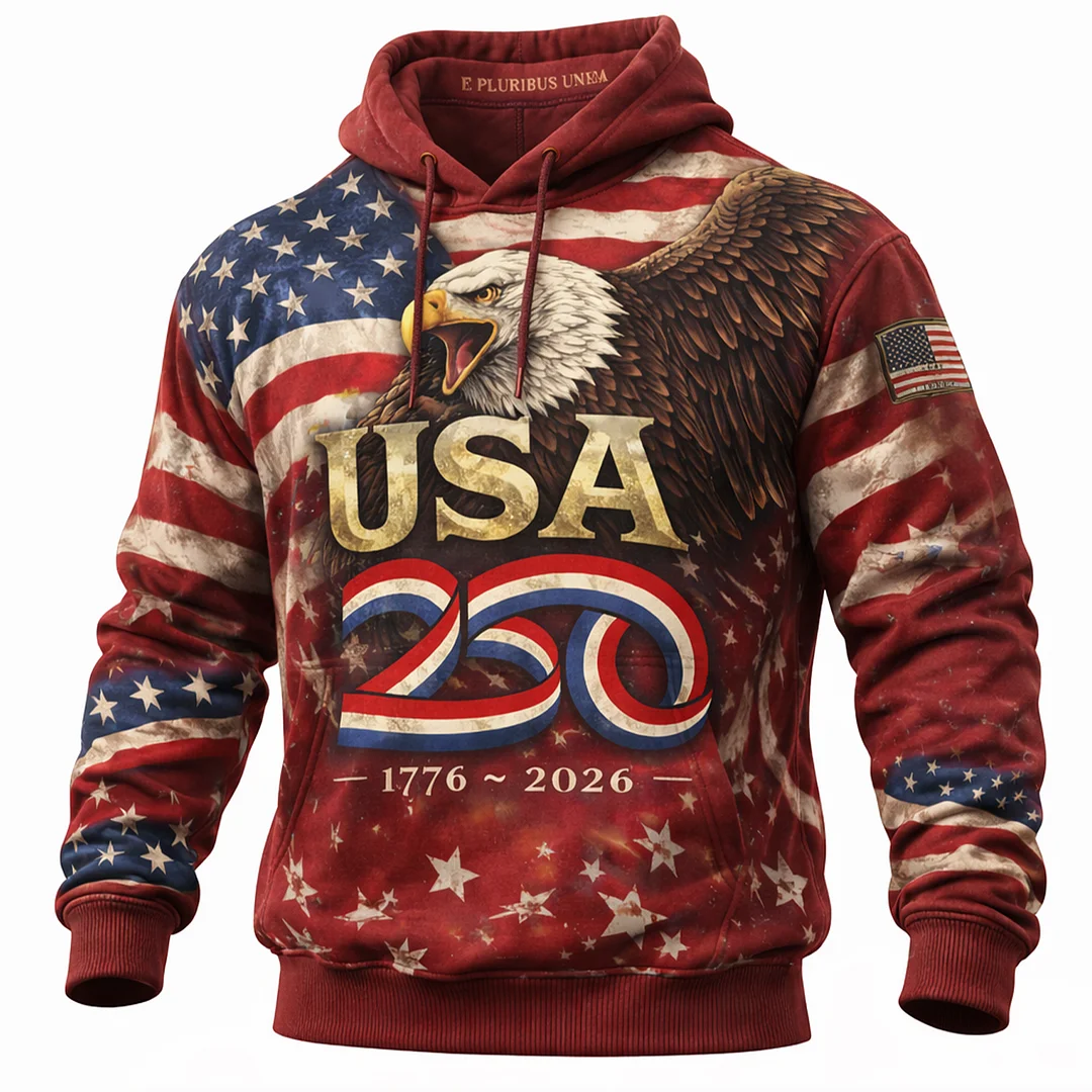 • Details: Front Eagle and Flag Print, "USA 250" Logo, Stars and Stripes Pattern, Patch on Sleeve
