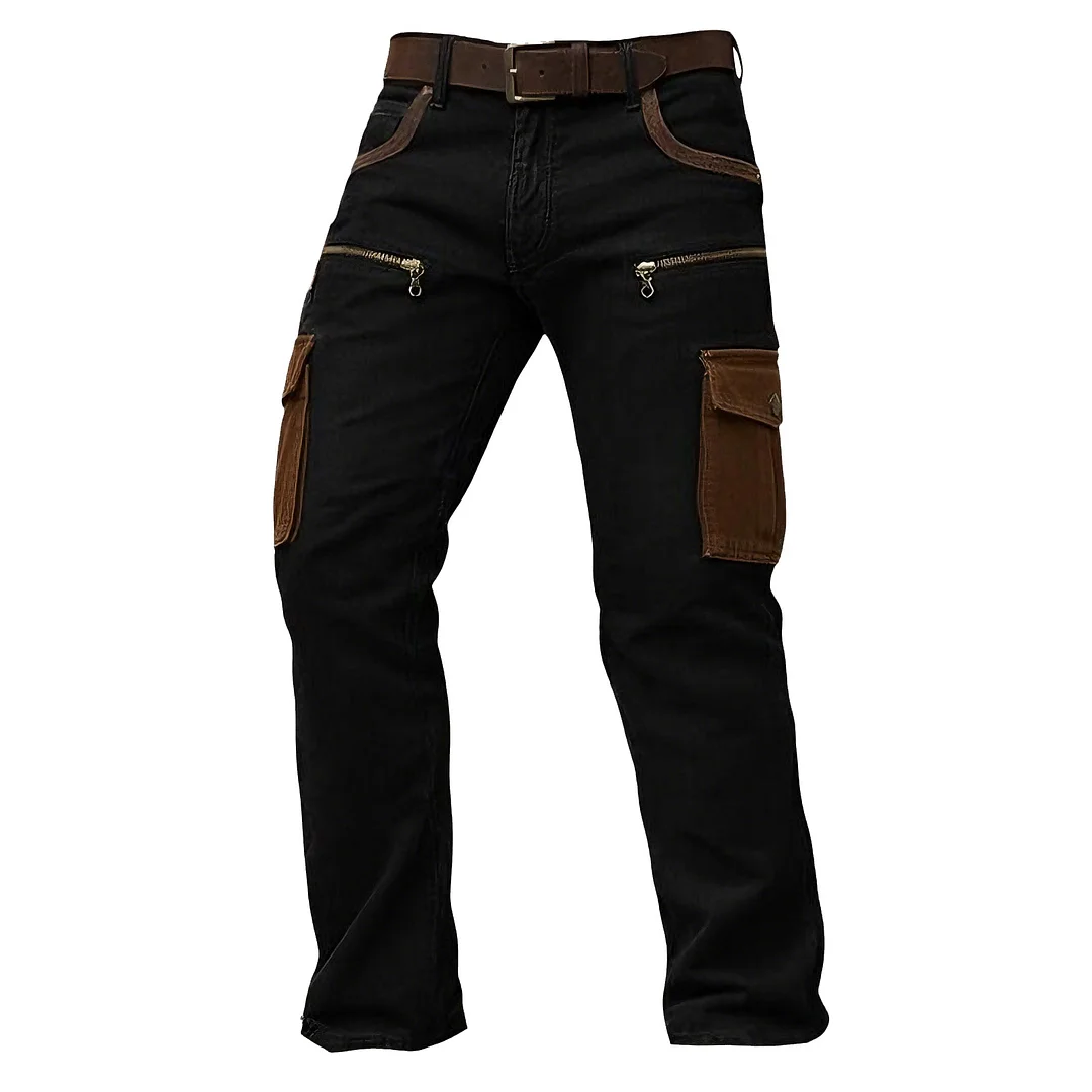 • Design Elements: Brown leather accents, zippered side pockets, cargo-style knee patches