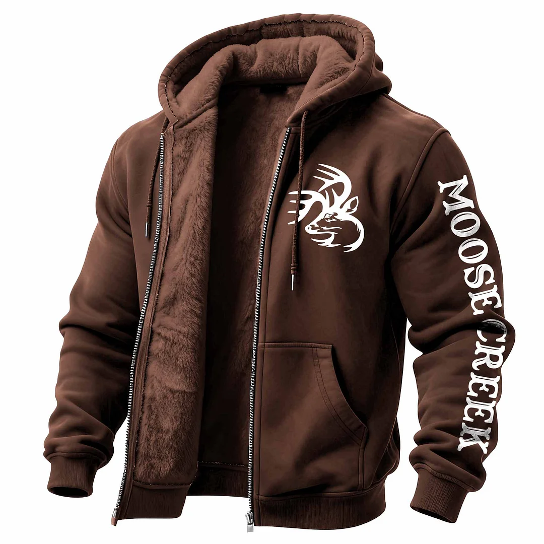 • Design Elements: Deer graphic on the chest, sleeve text, and a warm hood