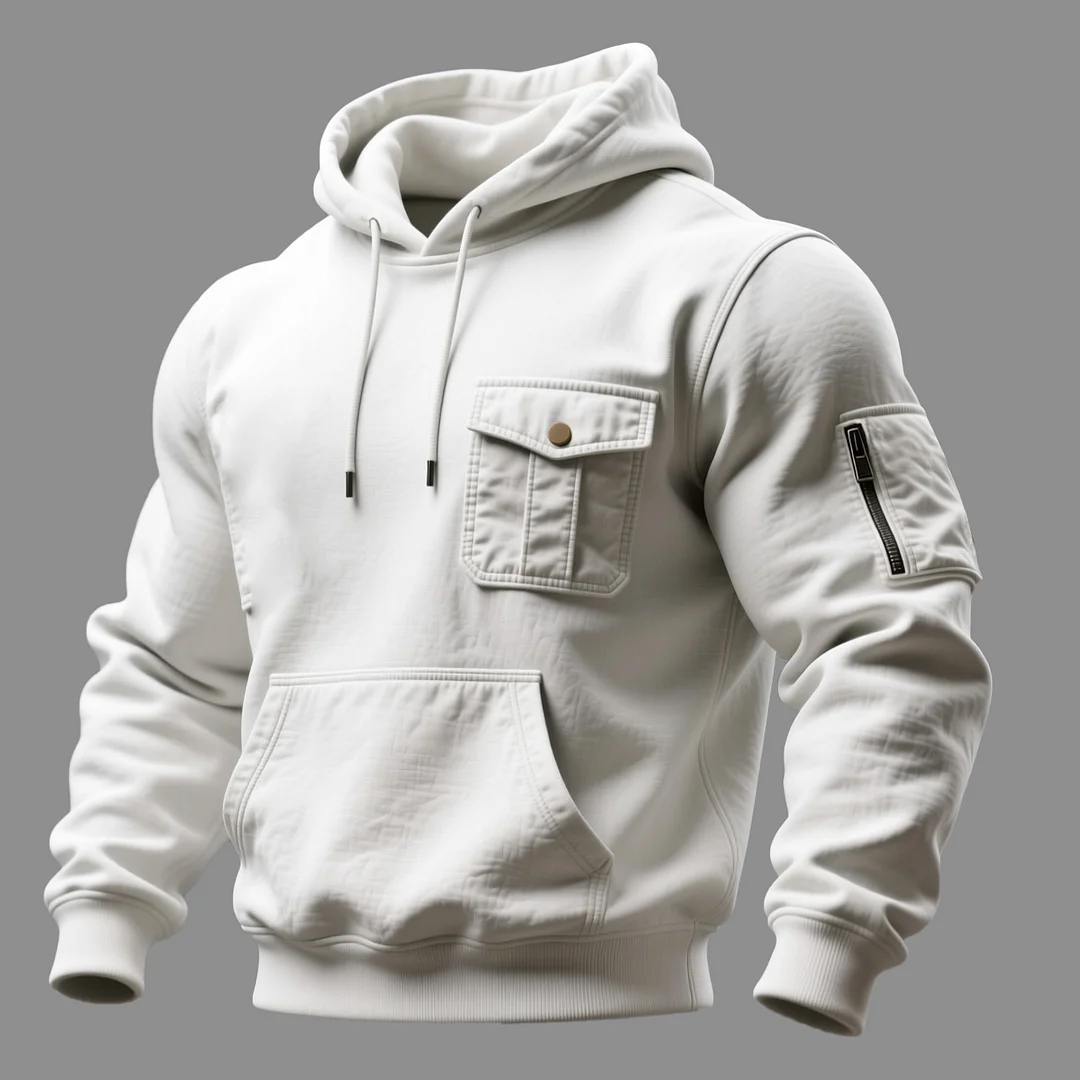 • Details: Chest flap pocket with snap button, front kangaroo pocket, zippered sleeve pocket, adjustable drawstring hood