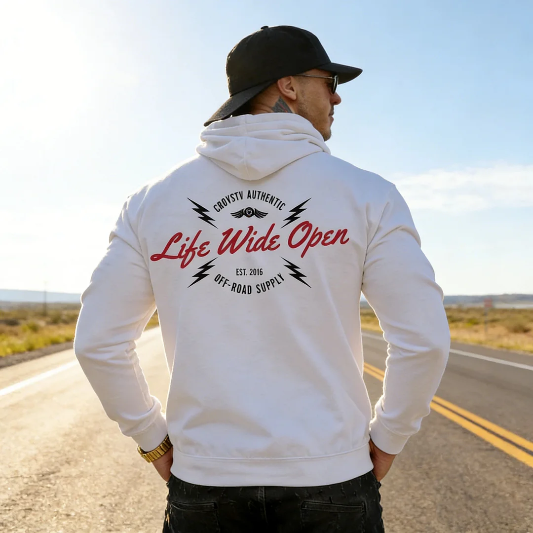 • Design Elements: Large Back Graphic Print, Red and White Typography, Star Accents, Layered Text Effect