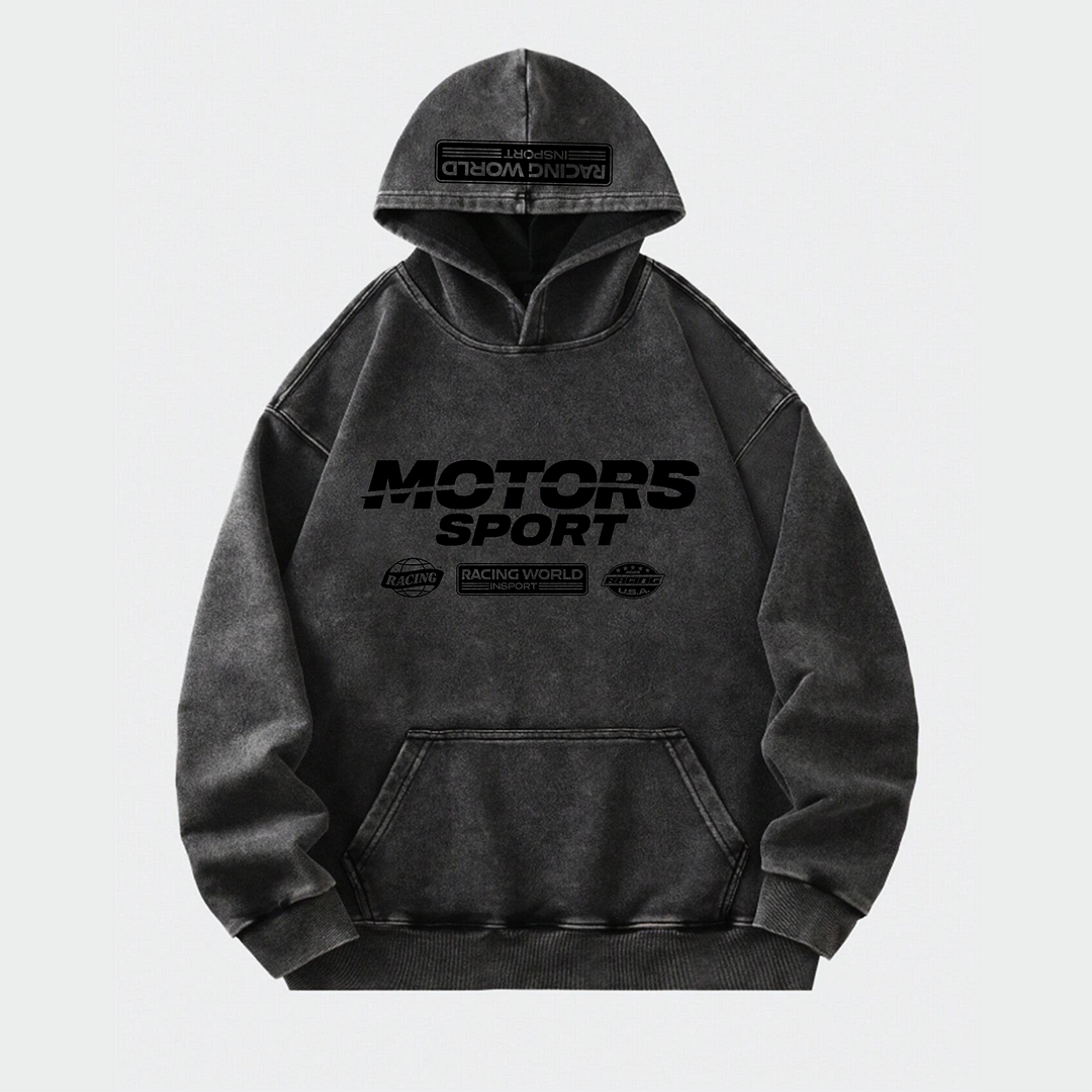 • Design Elements: Bold graphic print, front pocket, hooded design