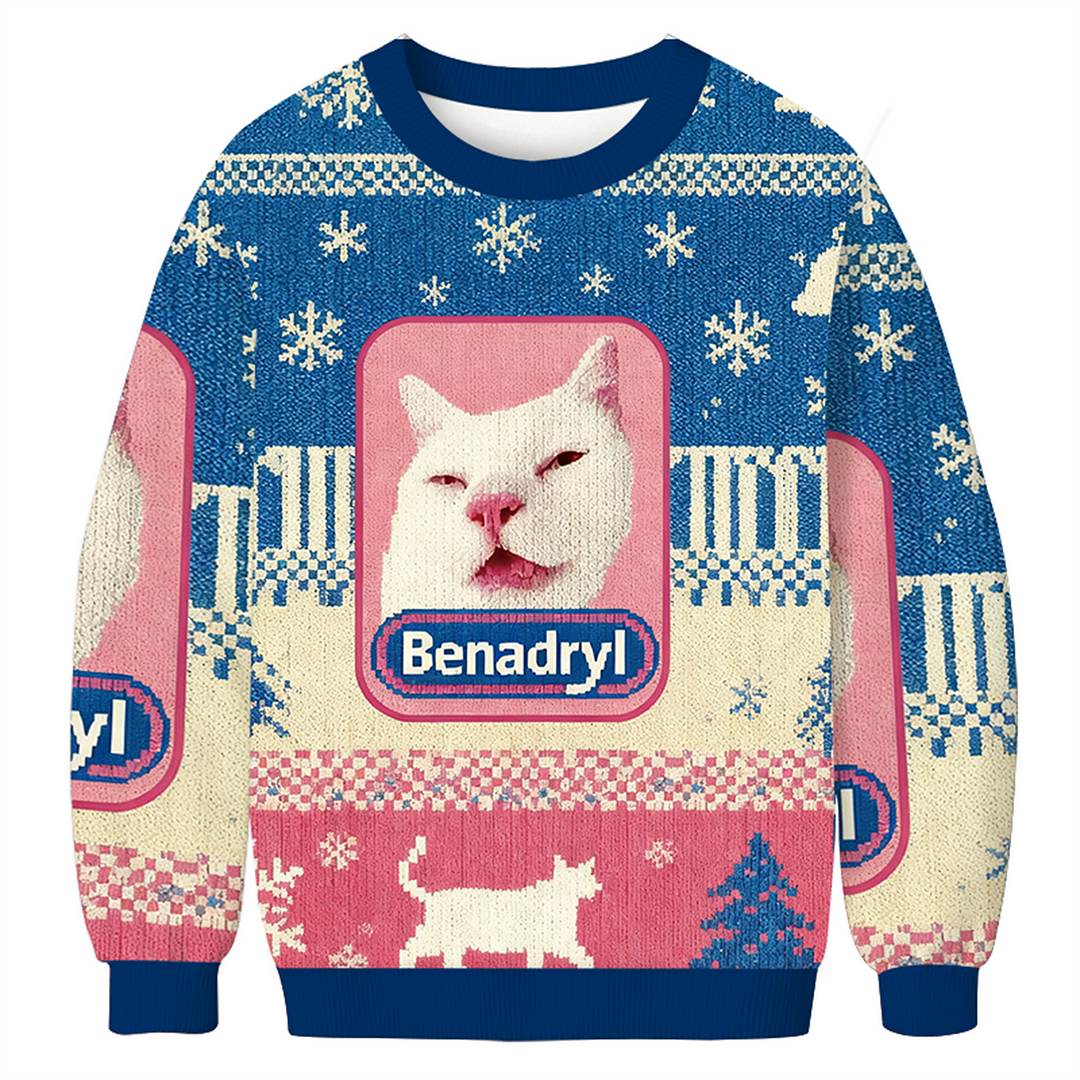 • Eye-catching cat graphic adds a playful twist to your holiday look.