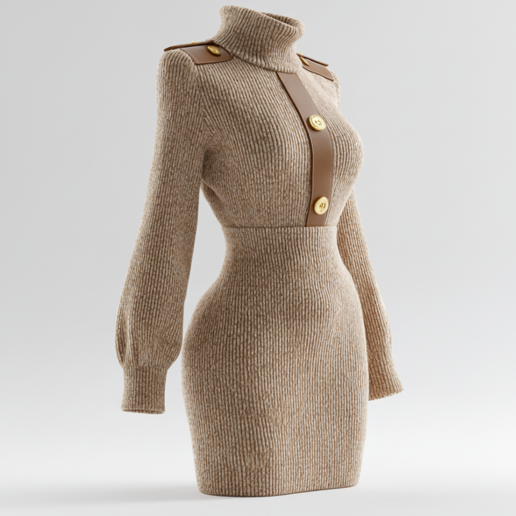 Women's Autumn Winter Turtleneck Cable Knit Dress - Waist-Cinching Slim Bodycon Sweater Dress