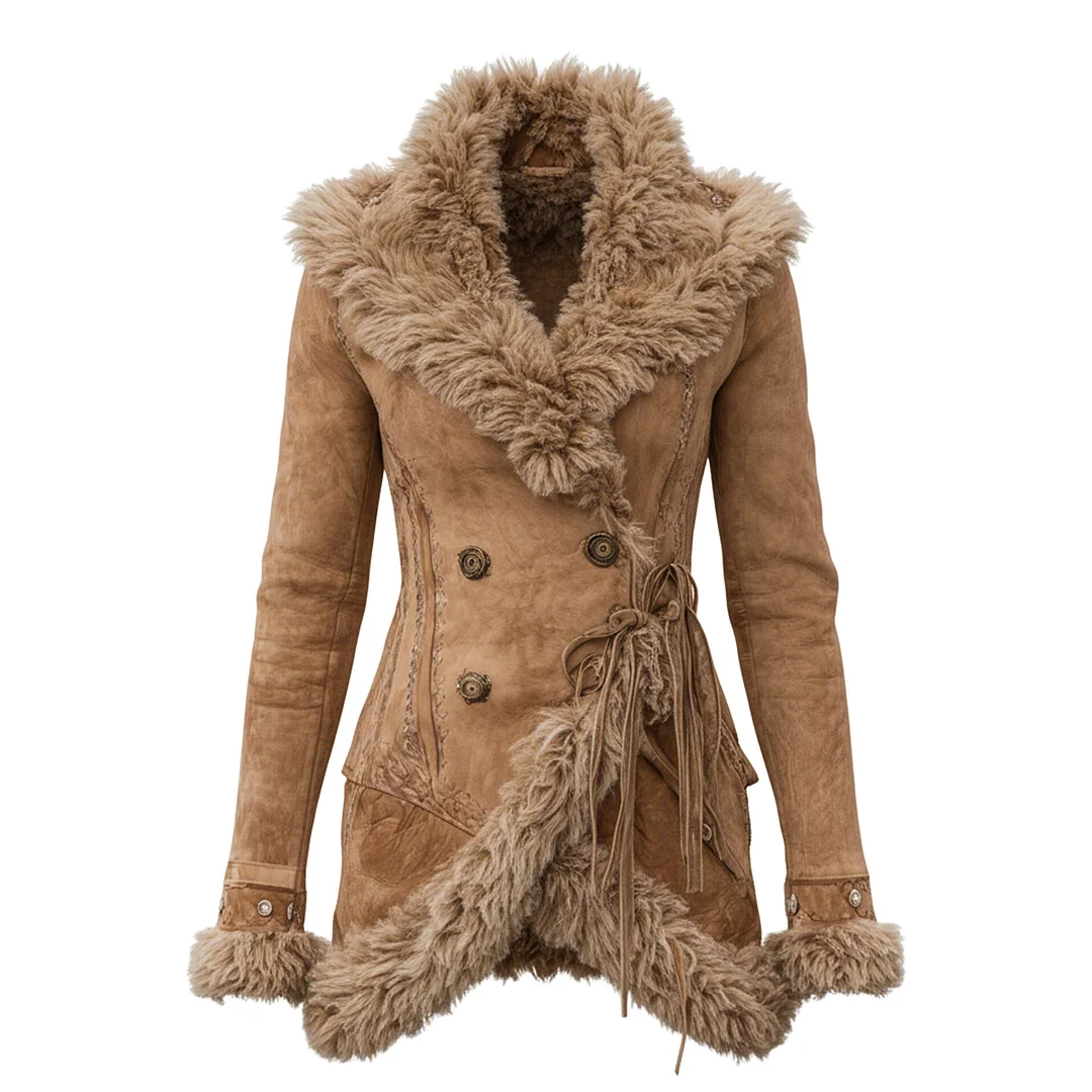 •    Design Elements: Double-breasted front with decorative buttons, shearling trim at the collar, cuffs, and hem