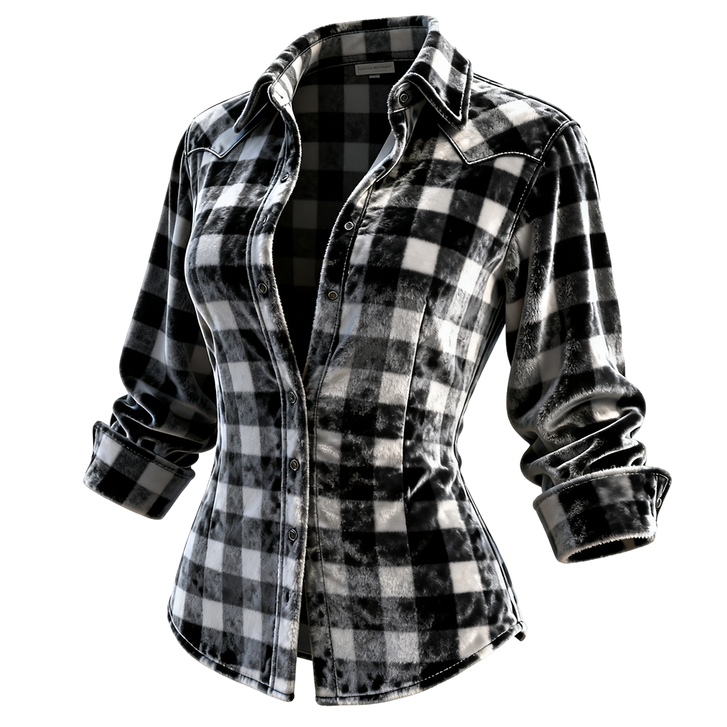 • Design Elements: Classic black and white checkered pattern, button-down front closure, rolled-up sleeves