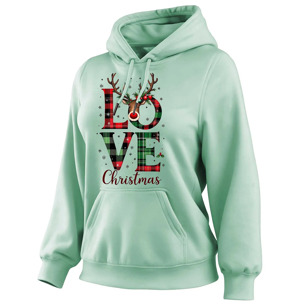 Women's Vintage Love Elk Christmas Print Long-Sleeve Mint Green Hoodie